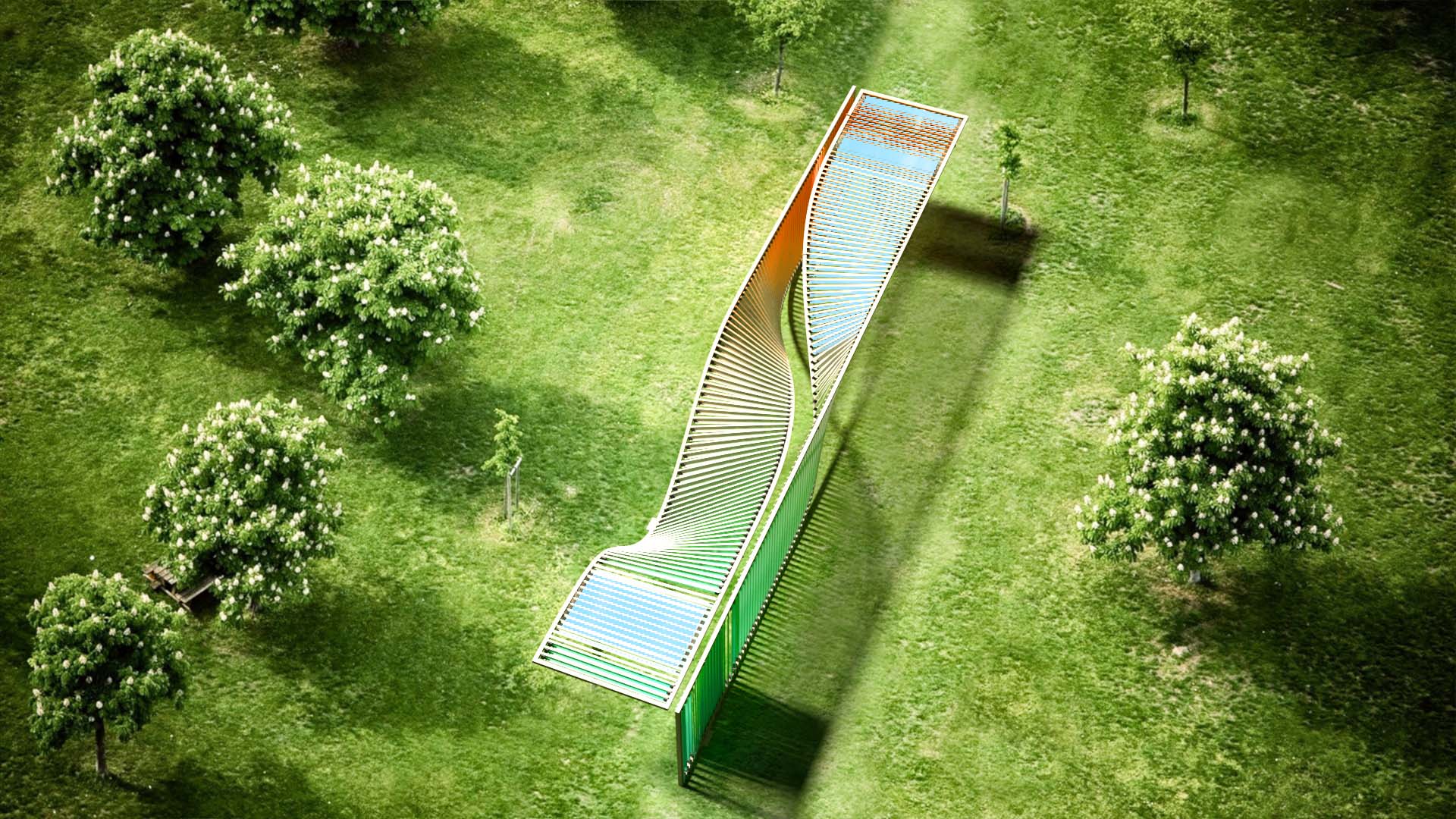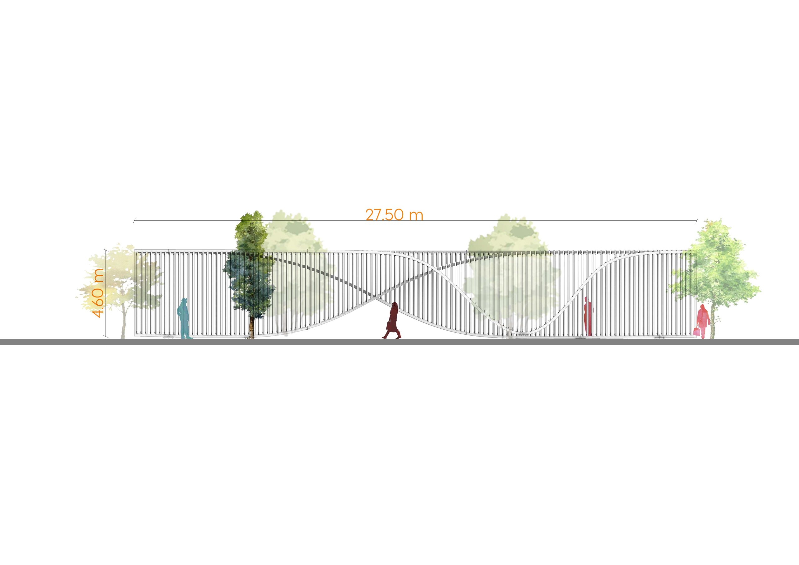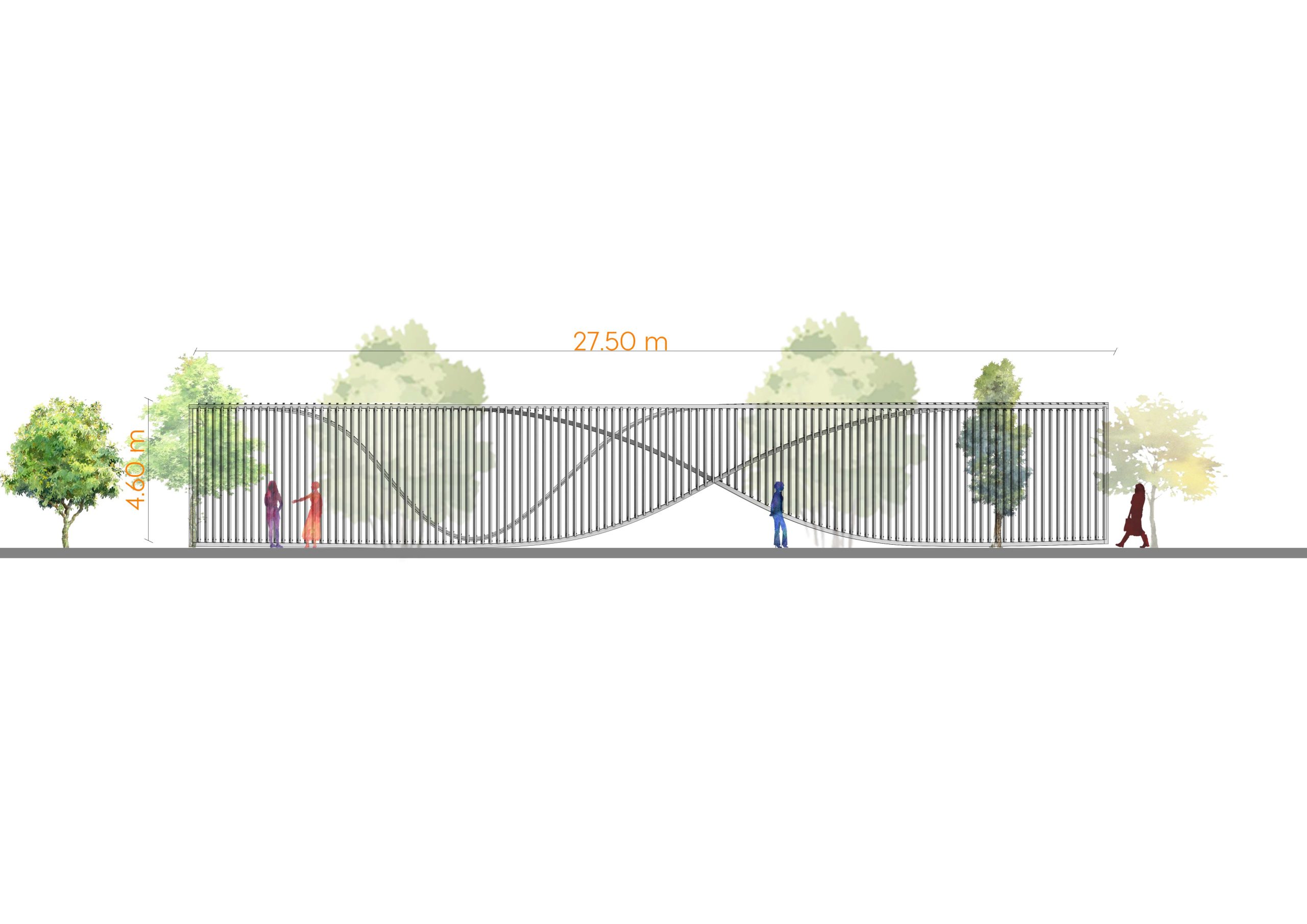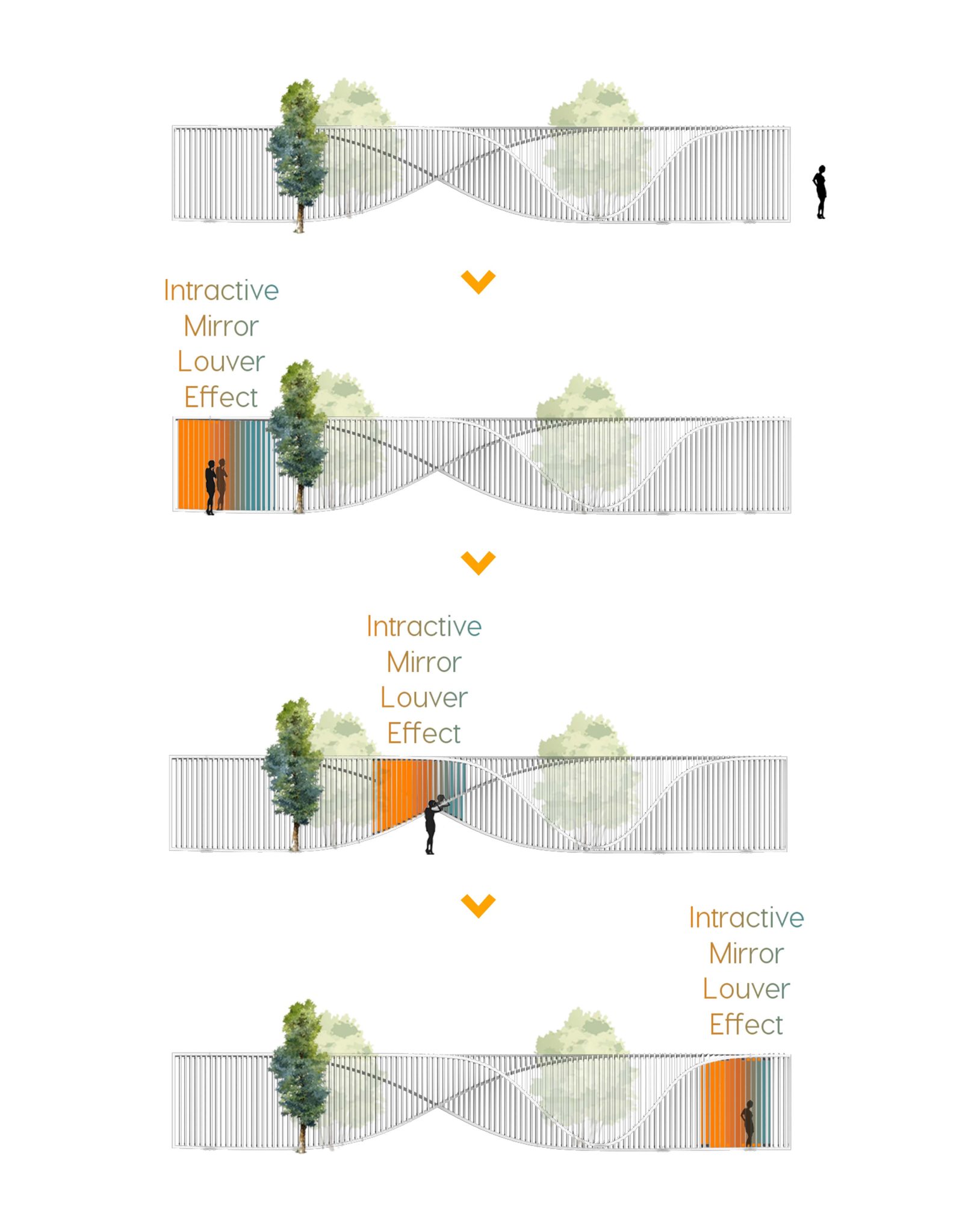 What if when a wall is passed by and it get turned on to both reflect this movement and react to it! Human usually welcome the chance of being surprised and communicate. This functional pavilion is a piece of synthetic creature which use technological possibilities to analyze environmental distance data (approaching-leaving objects) and response to it by moving it squama’s! A lacy-tracy metaphoric piece of architecture as flexible as fabric with a trendy gradient outlook. How it behaves looks like the Merilyn Monroe skirt effect in architecture; playful and memorable