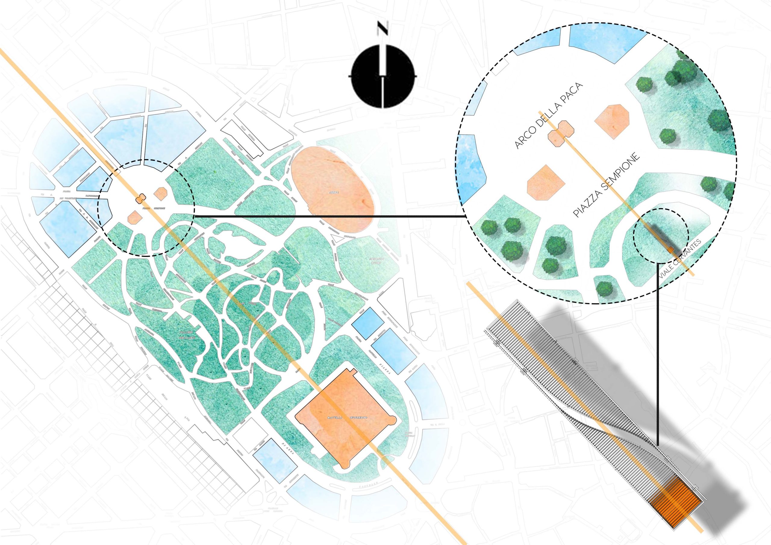 From Arch of Peace to Sforza Castle there is a sweet moment of contextual twist beneath the Sempione Park! This critical attitude could be softened by a relaxed transition in-between these landmarks. Respecting both; a linear pavilion could be proposed in a way to organize a connection while addressing both and the surrounding fashion events. Therefore; the direction between these two objectives has been regarded as the project axis while emphasizing on the linear pedestrian’s circulation in the park.