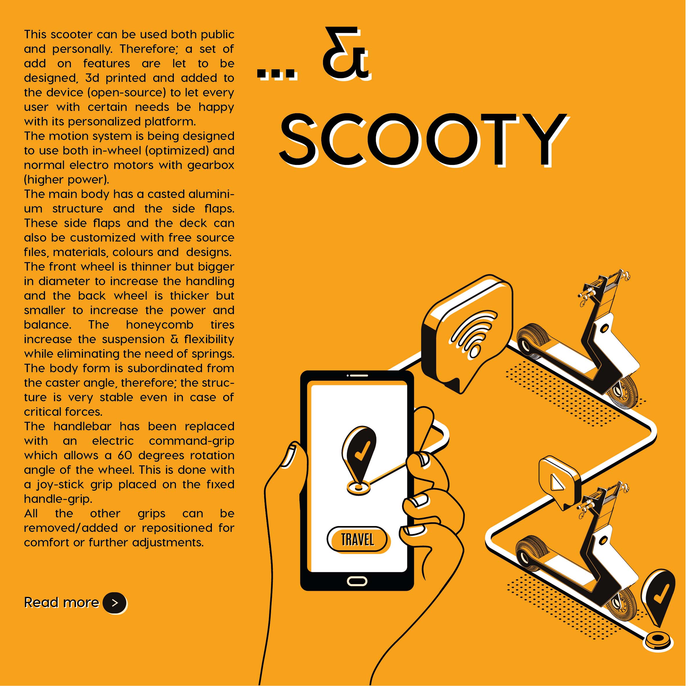 This scooter can be used both public and personally. Therefore; a set of add on features are let to be designed, 3d printed and added to the device (open-source) to let every user with certain needs be happy with its personalized platform.