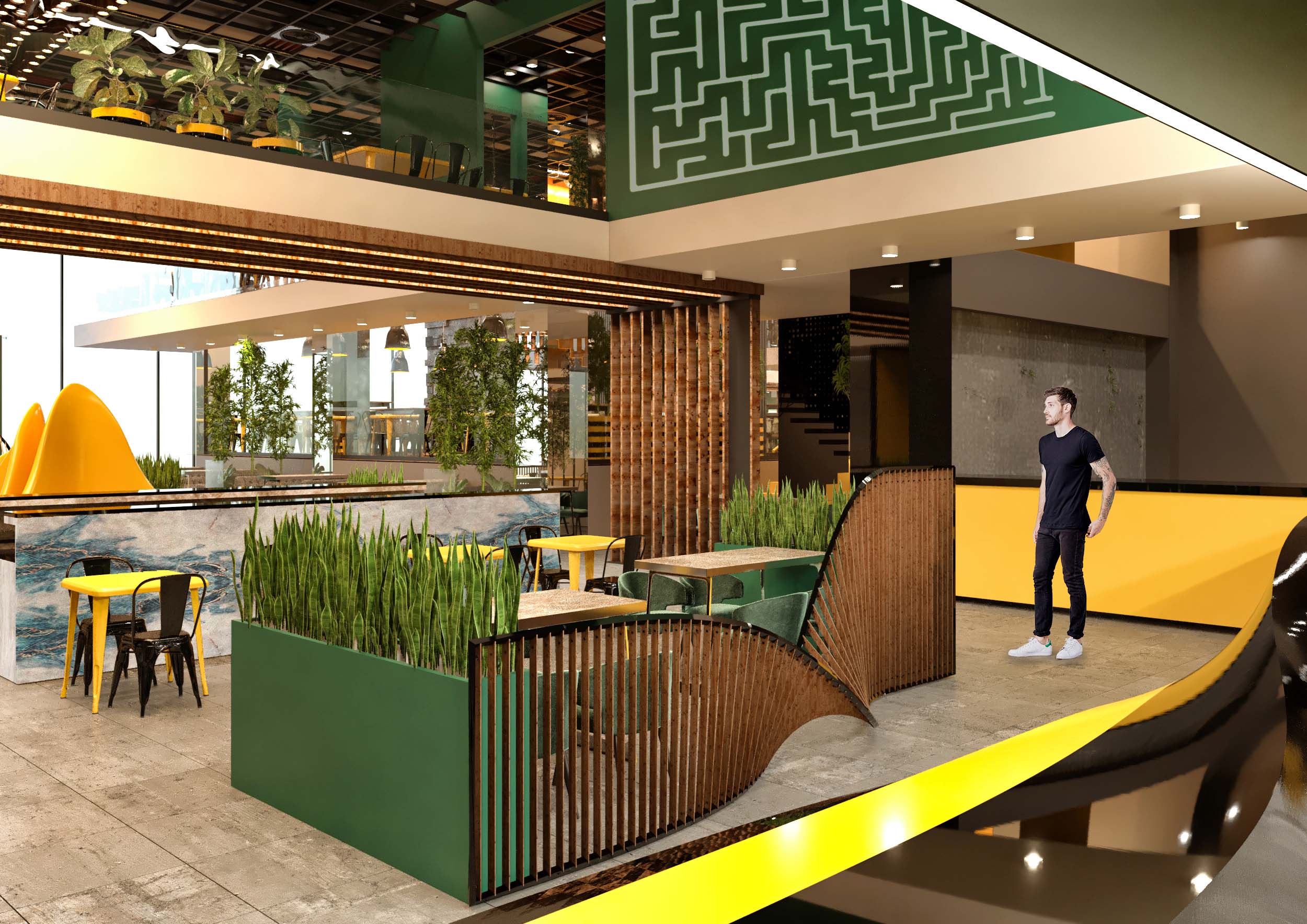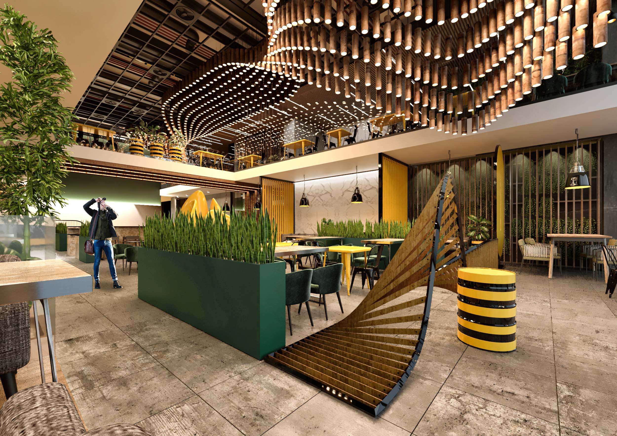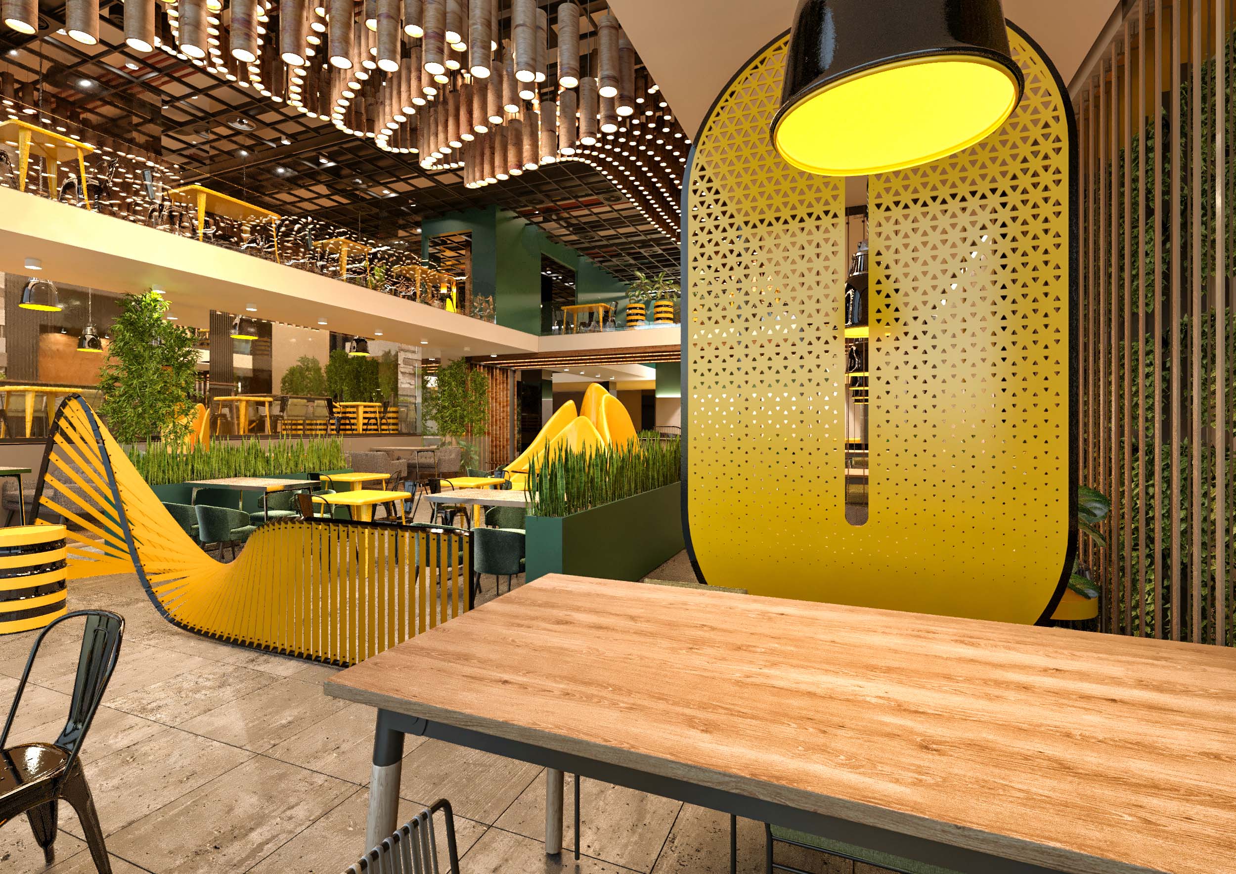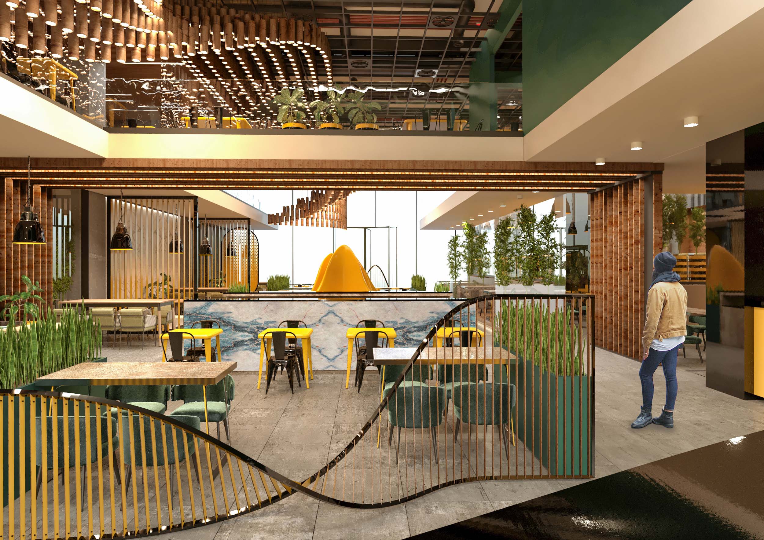 A variety of metallic & velvet furniture has been applied next to wooden and tarnish in the mood board of the space for more exuberance. A warm pallet of glossy yellow and matte royal-green has re-touched every element in the space in a harmonic manner.