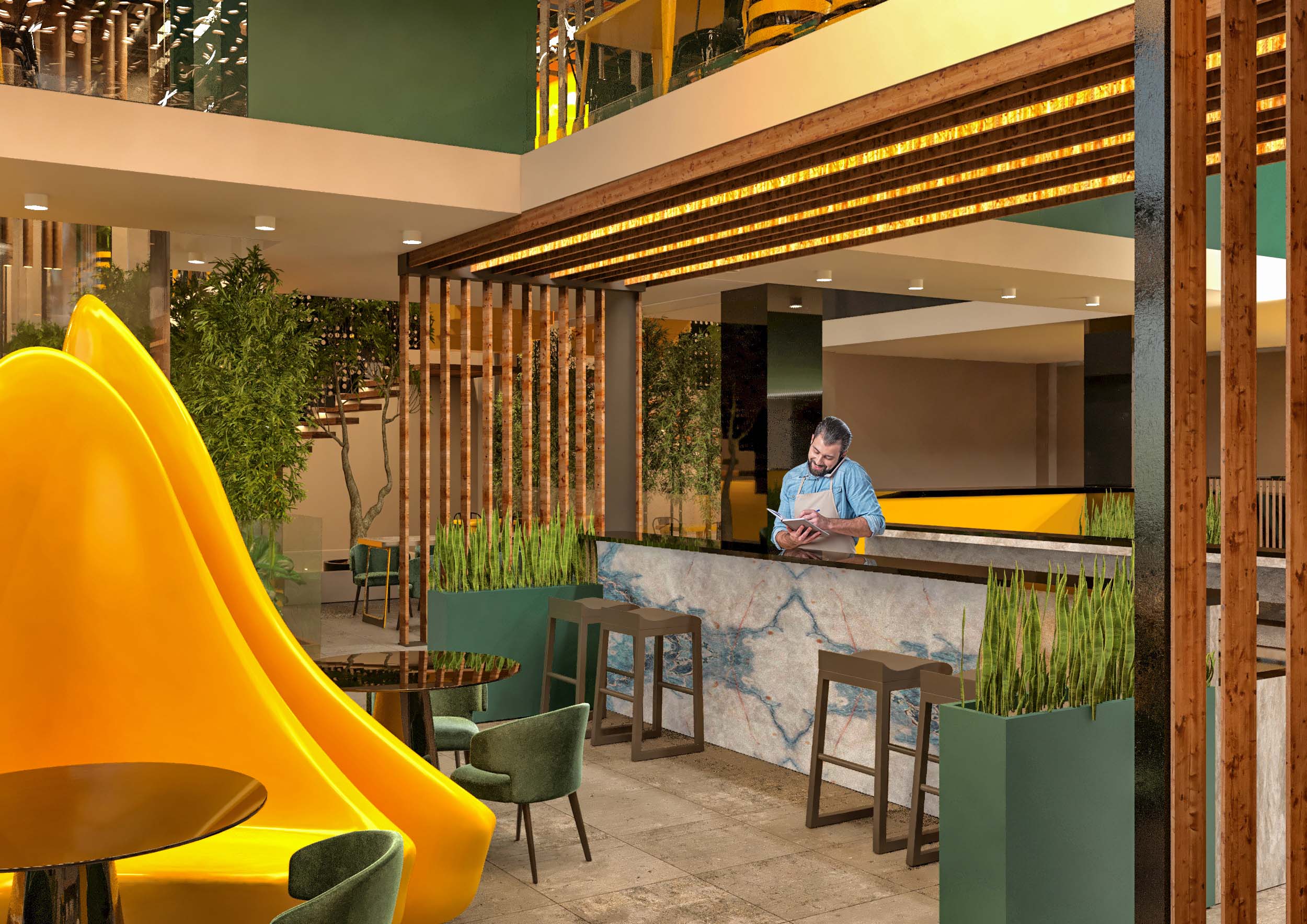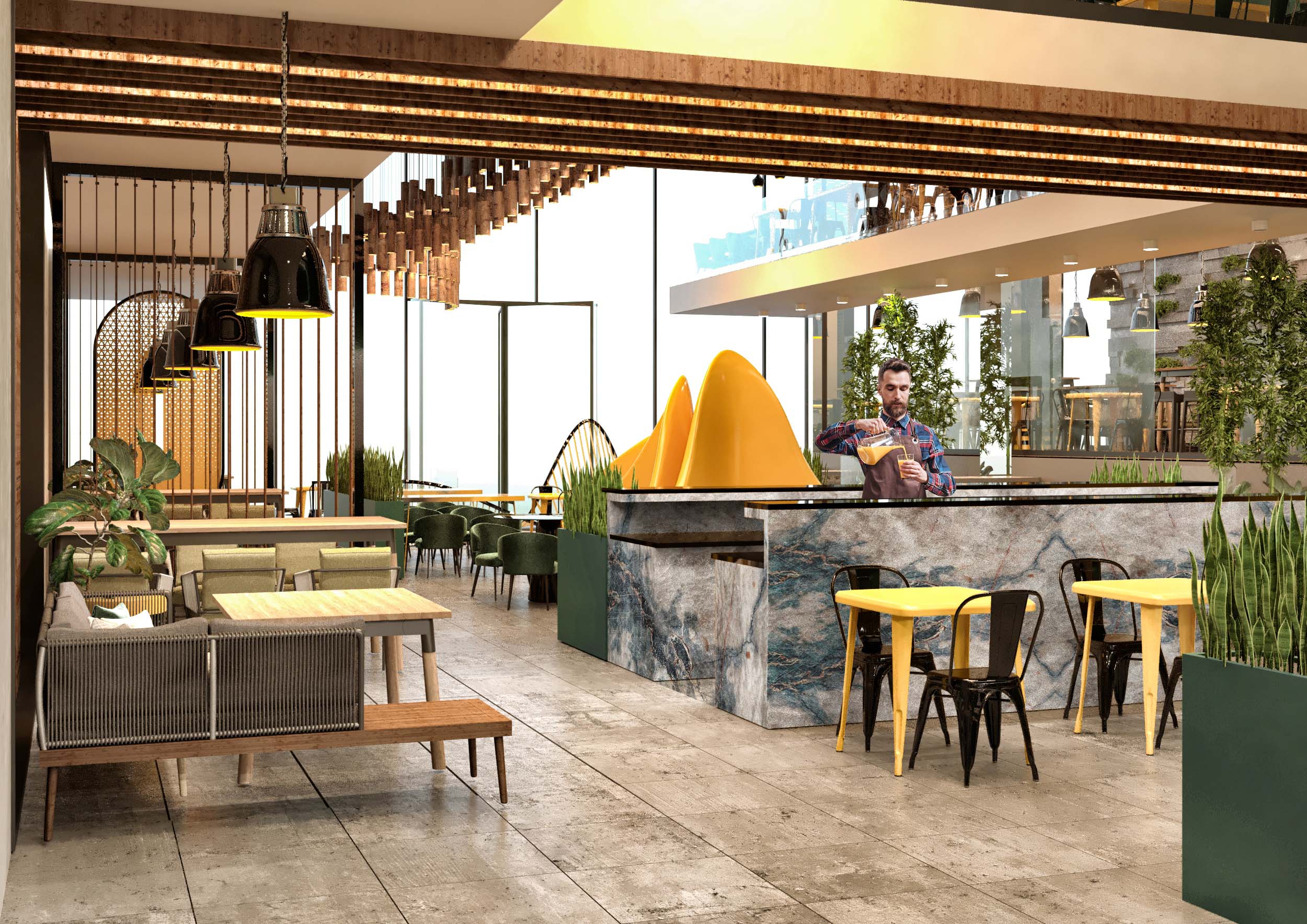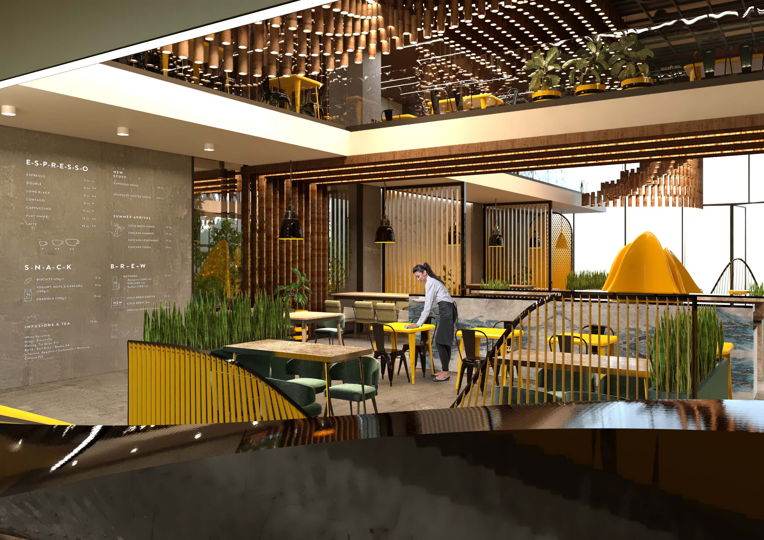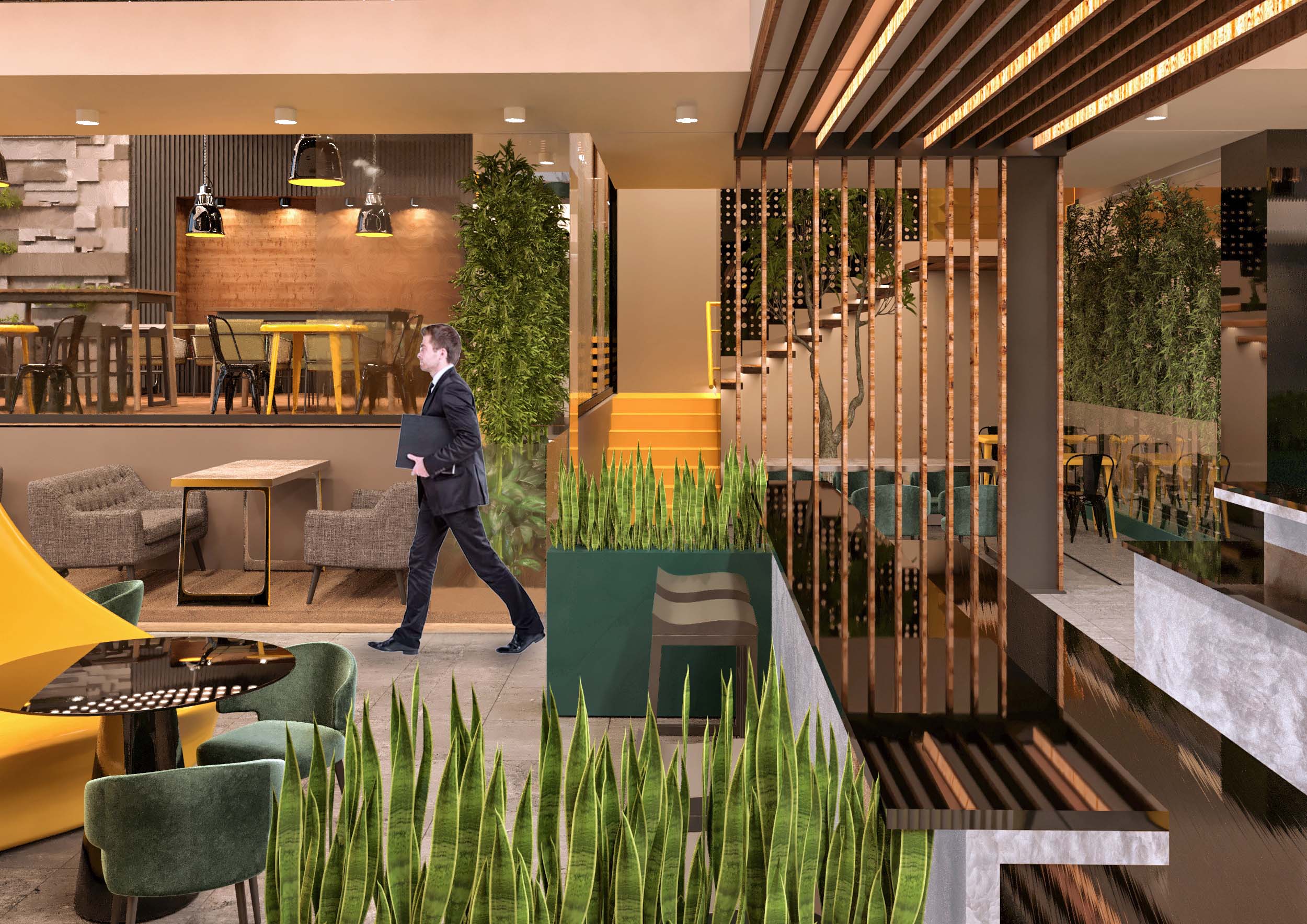 A variety of metallic & velvet furniture has been applied next to wooden and tarnish in the mood board of the space for more exuberance. A warm pallet of glossy yellow and matte royal-green has re-touched every element in the space in a harmonic manner.