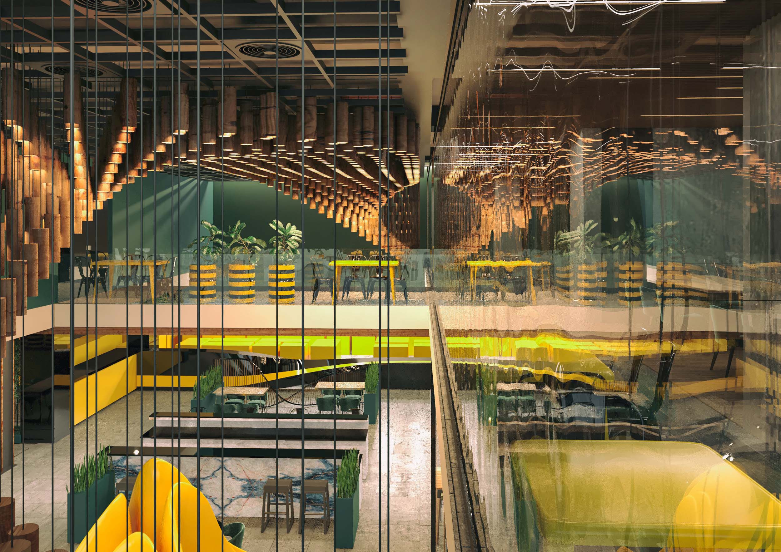 All over the void and the terrace 2 continues parametric chandeliers arr hanged as sculptural installations.