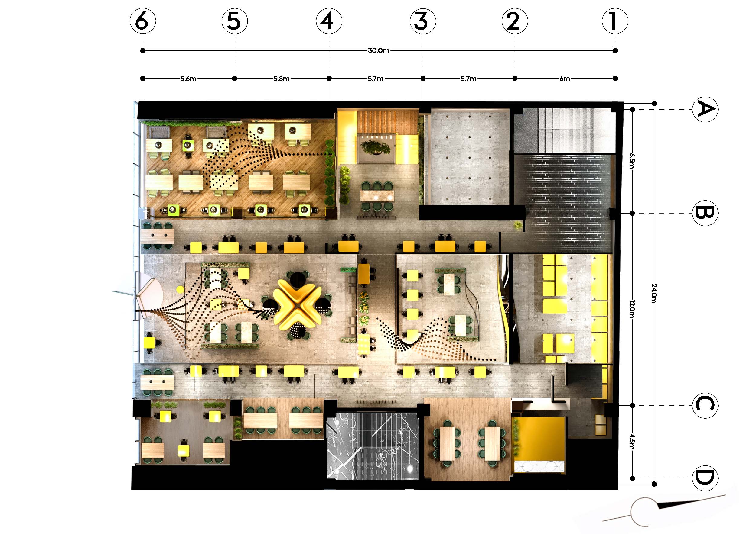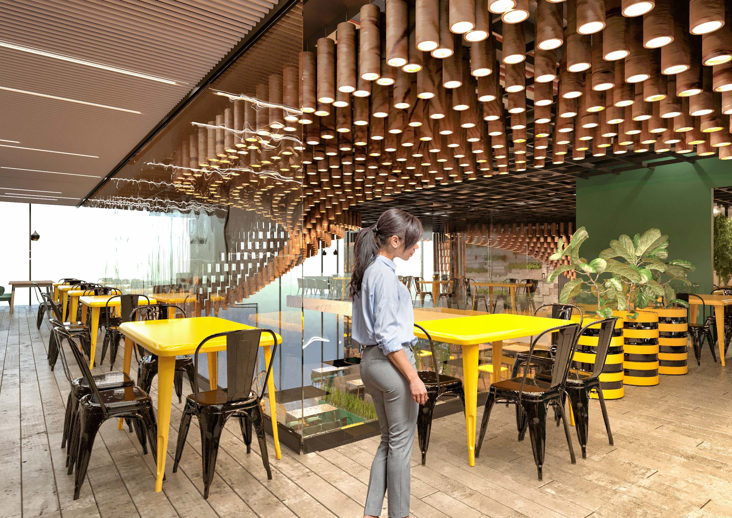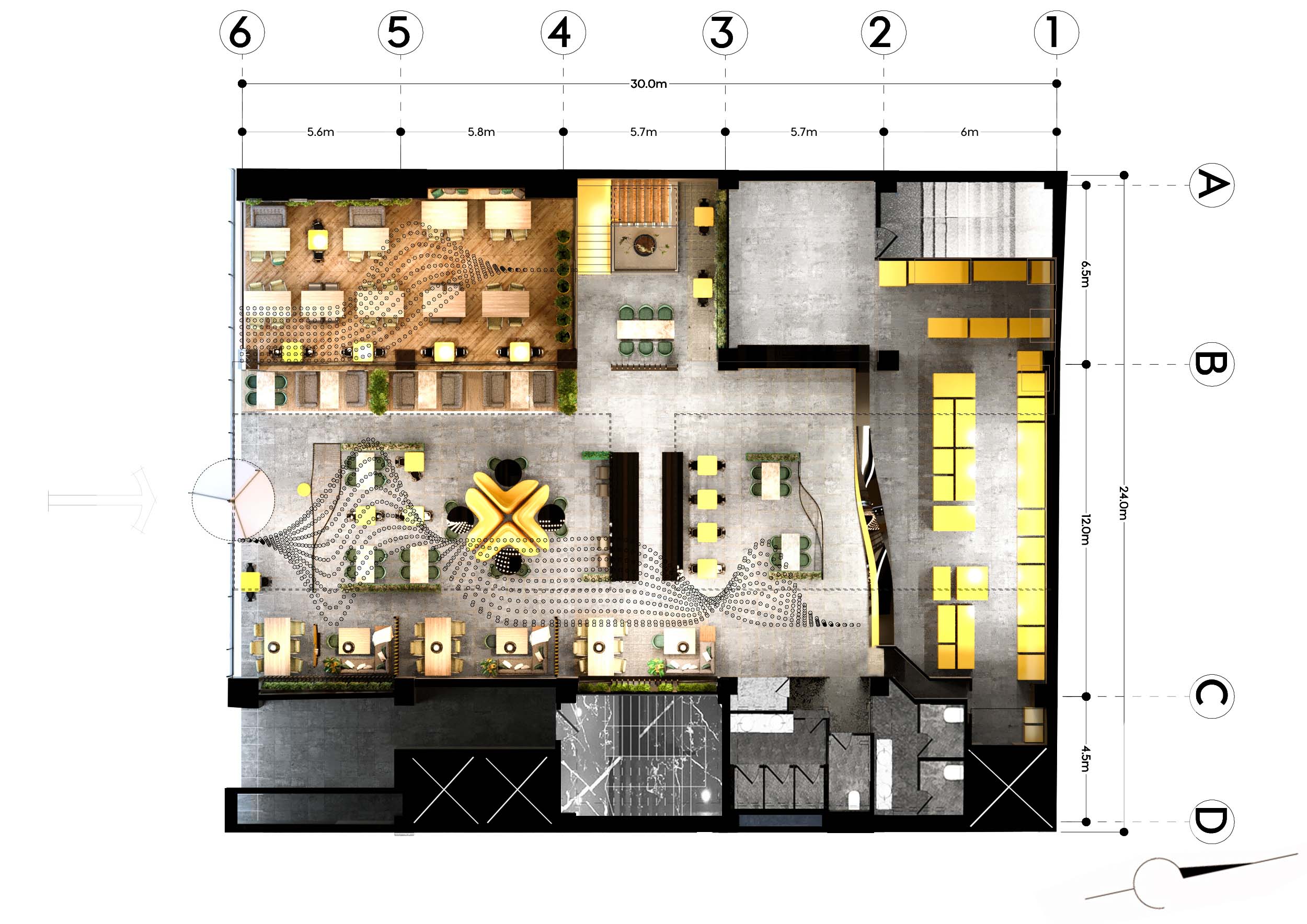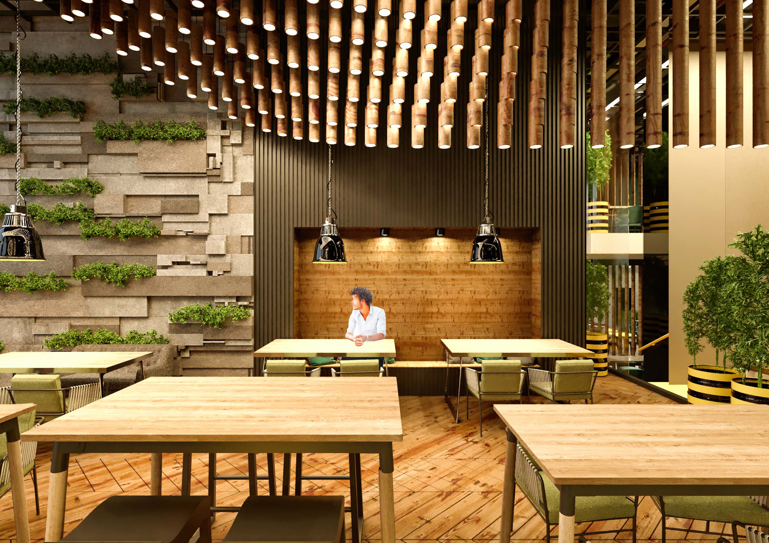 The restaurant is mainly divided into 3 leveled zones; the Main Hall, the Balcony and the Terrace.