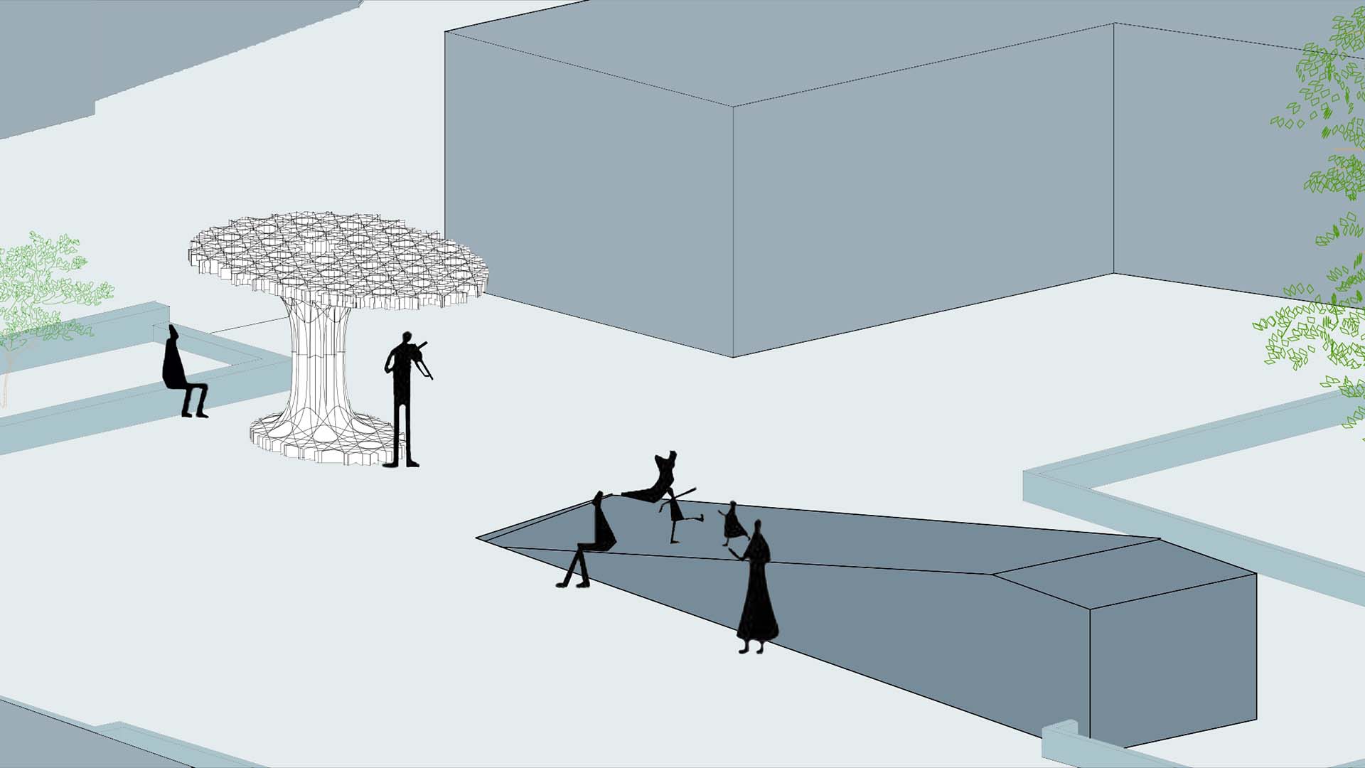 These elements then cast geometrical shadows and creates a playful shade for the pedestrians yet look native to them since the geometry is derived directly from their urban context and ornaments.