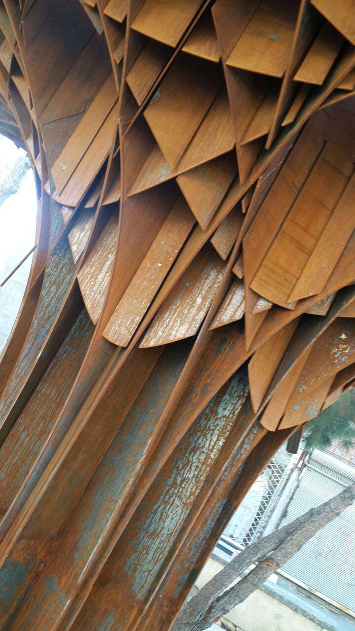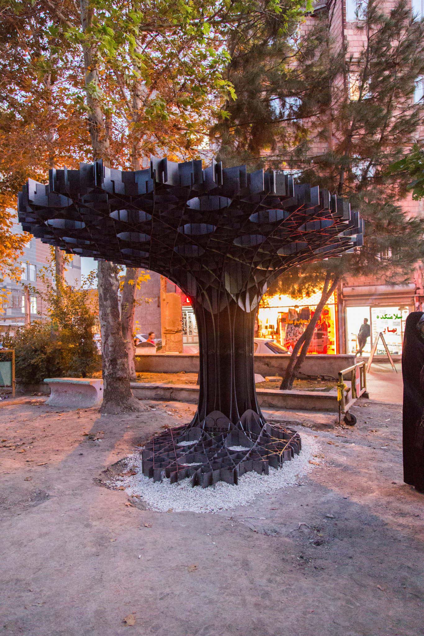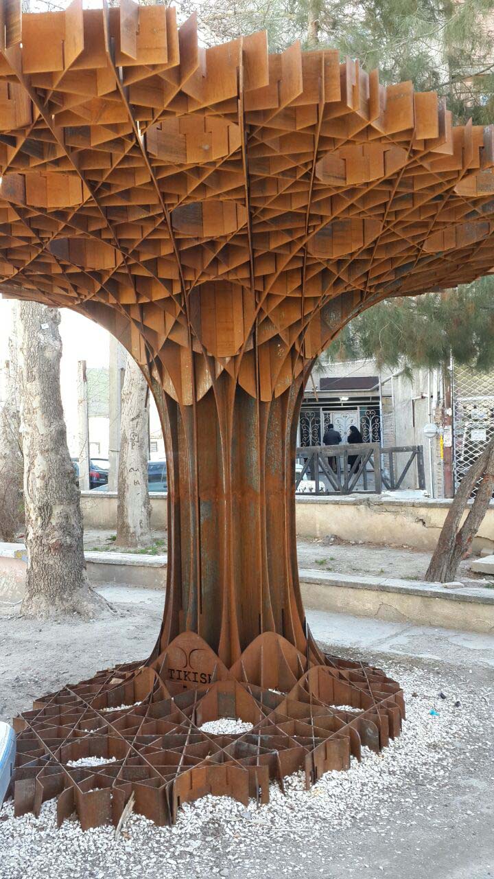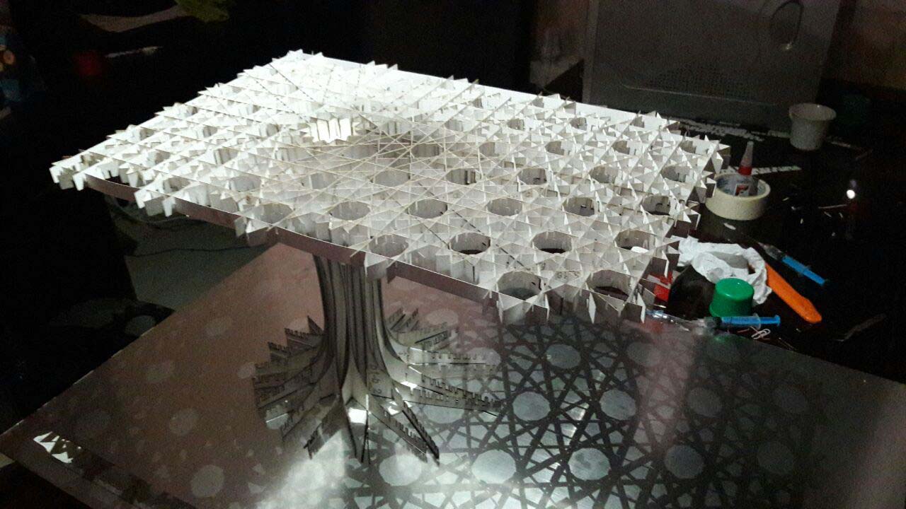 Horizontal surface which is arising from the floor is holding the object in place just like the root and trunk of a tree, converts to vertical (based on static optimization of the structure) elements of the pavilion and eventually lead to the vertical orientation of the upper surface as the branches of a tree.