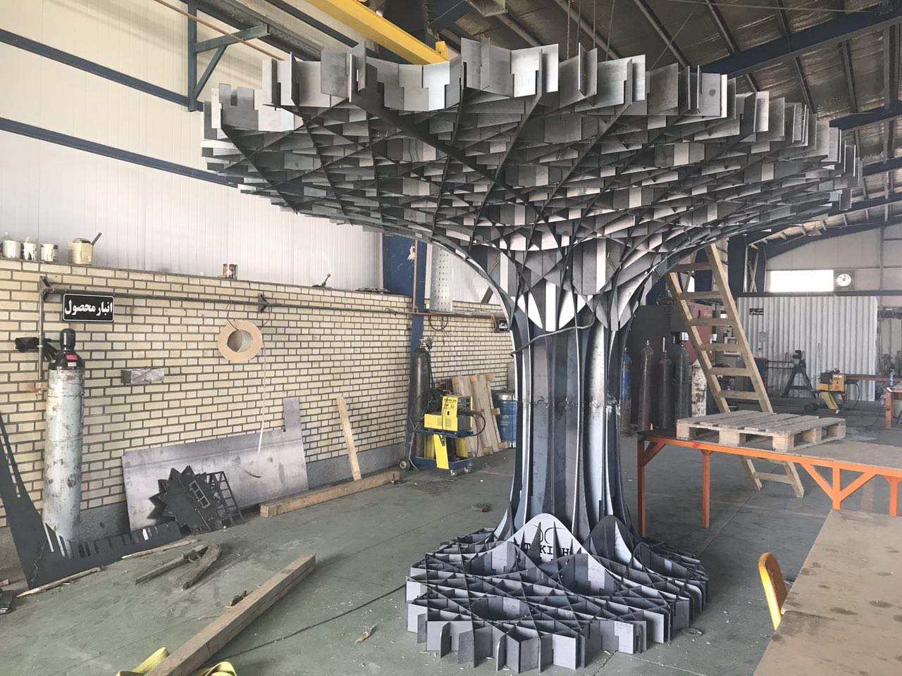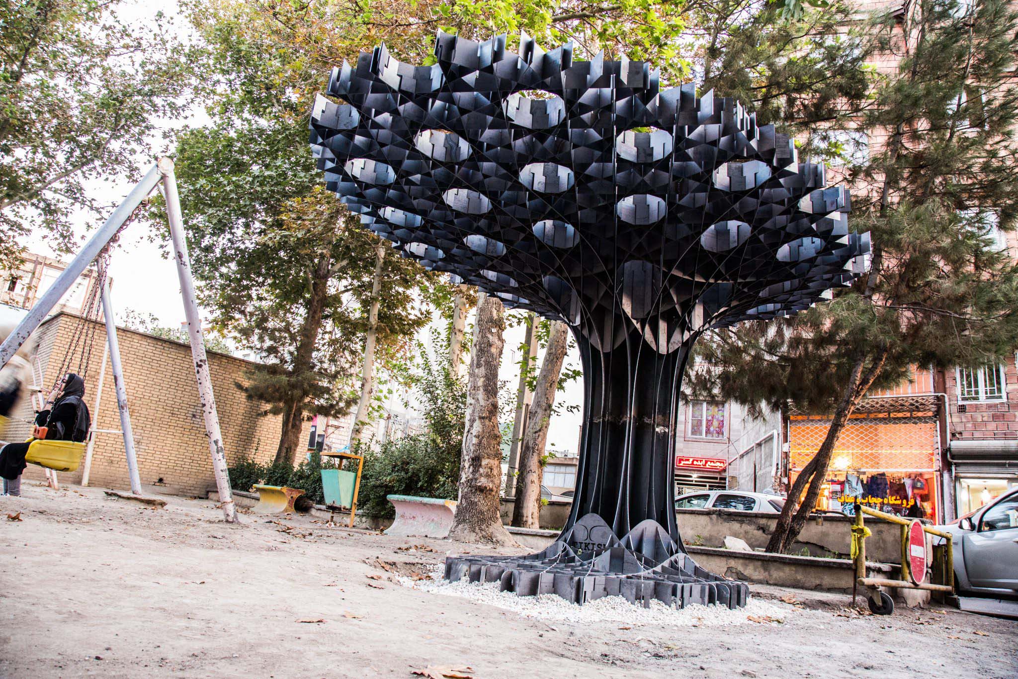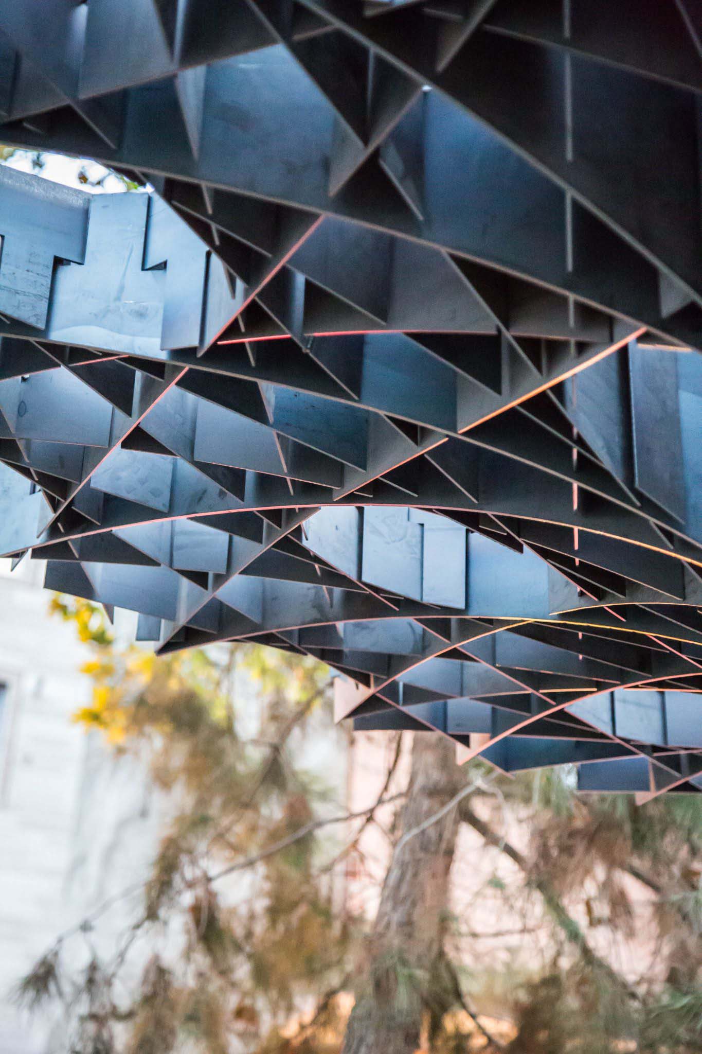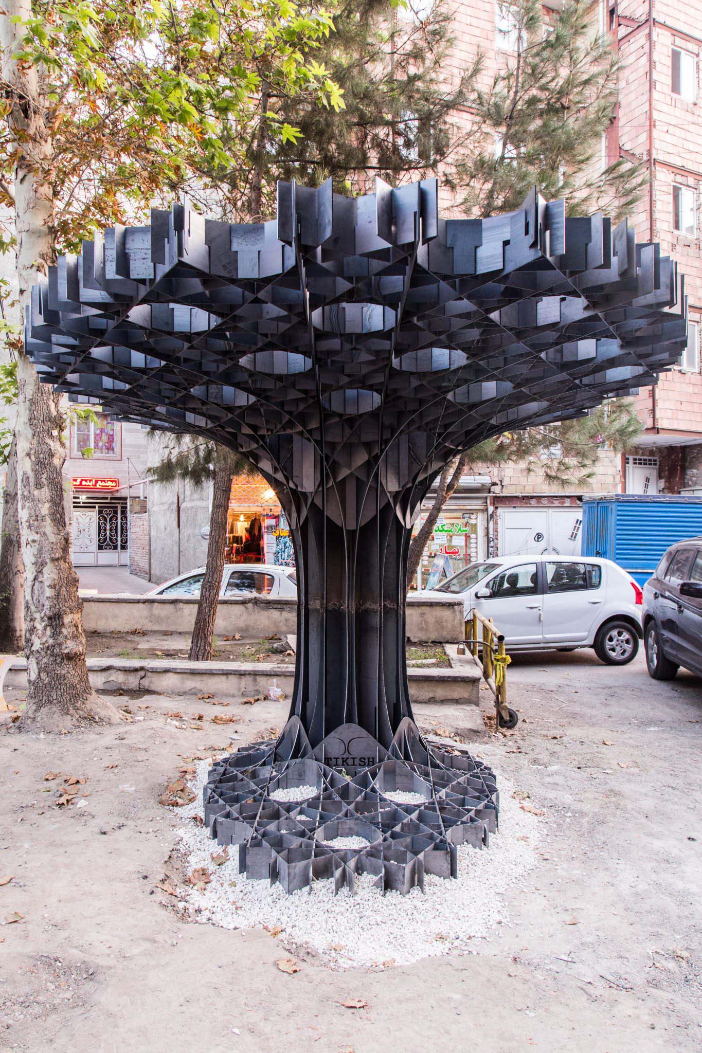 Horizontal surface which is arising from the floor is holding the object in place just like the root and trunk of a tree, converts to vertical (based on static optimization of the structure) elements of the pavilion and eventually lead to the vertical orientation of the upper surface as the branches of a tree.