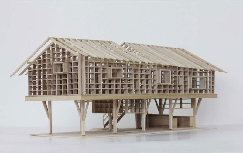 A double-pitched gable roof echoes local architecture but reinterprets it with a sharper profile.